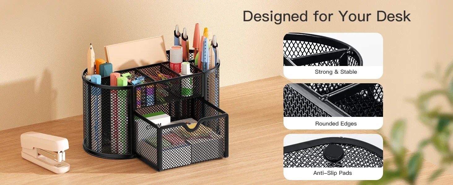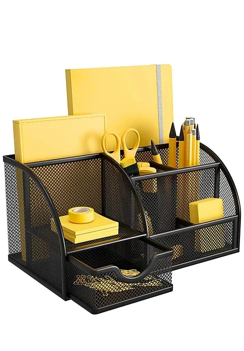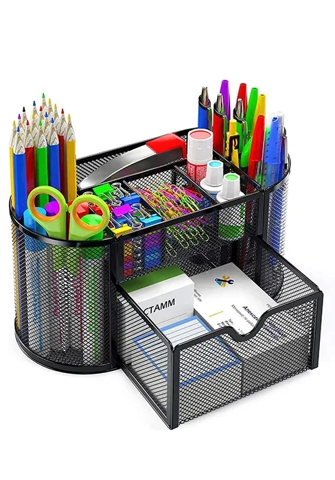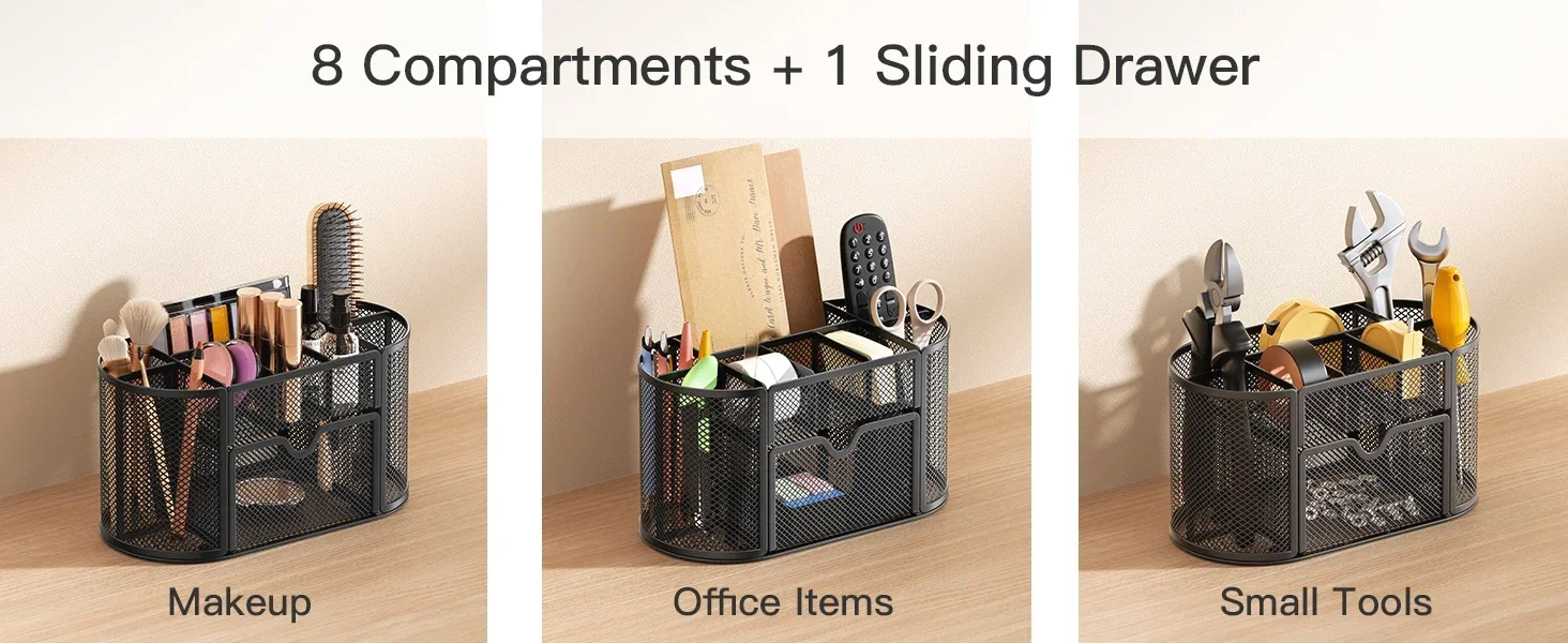 This mesh desktop organizer has 9 compartments (8 parts + 1 slide drawer ) for your pens, pencils, sharpeners, staplers, scissors, rulers, razors, glue sticks and suitable for home, office, work, school, classroom, studio, etc
