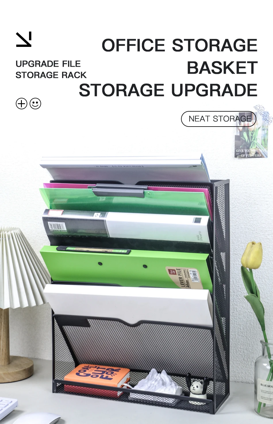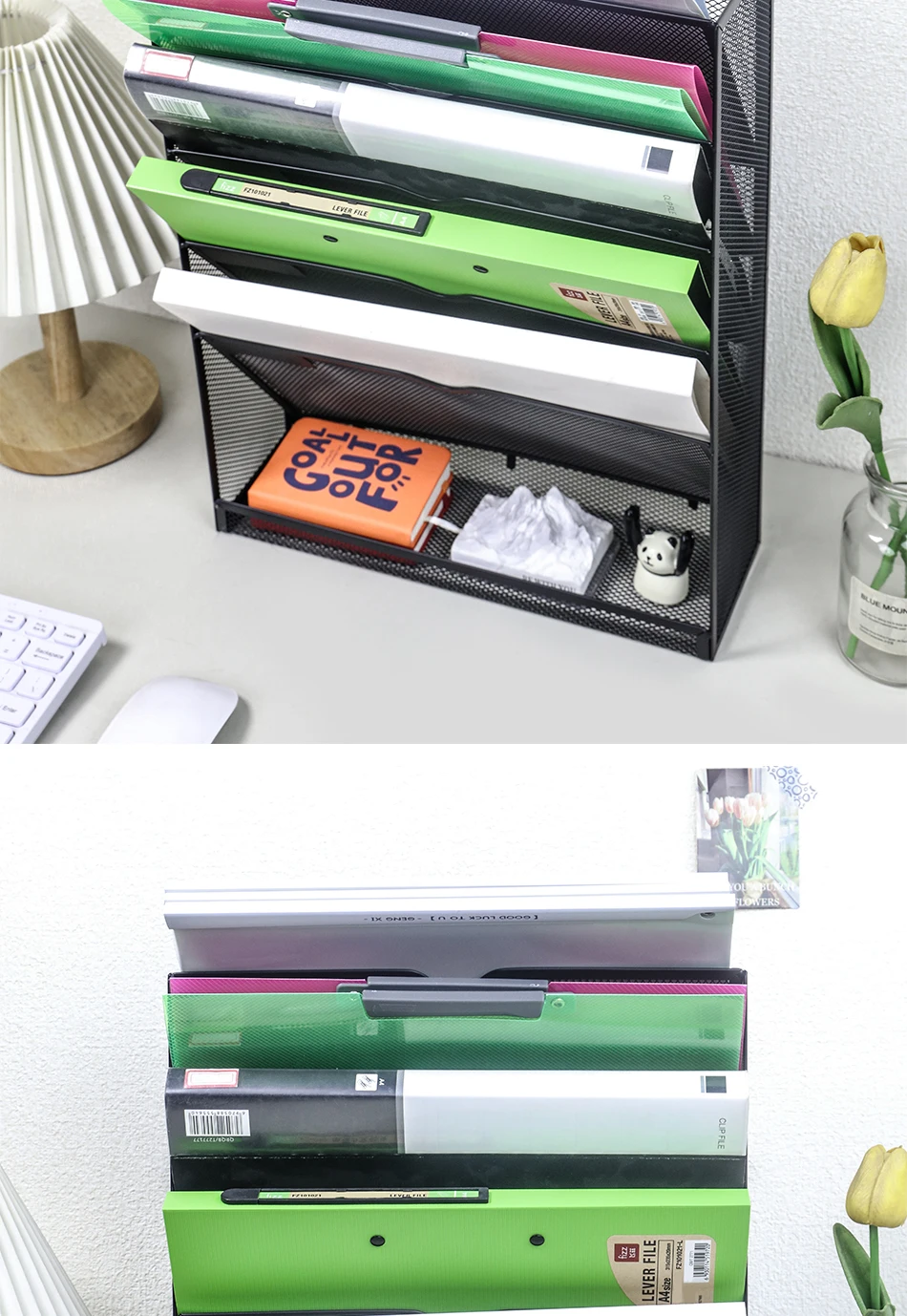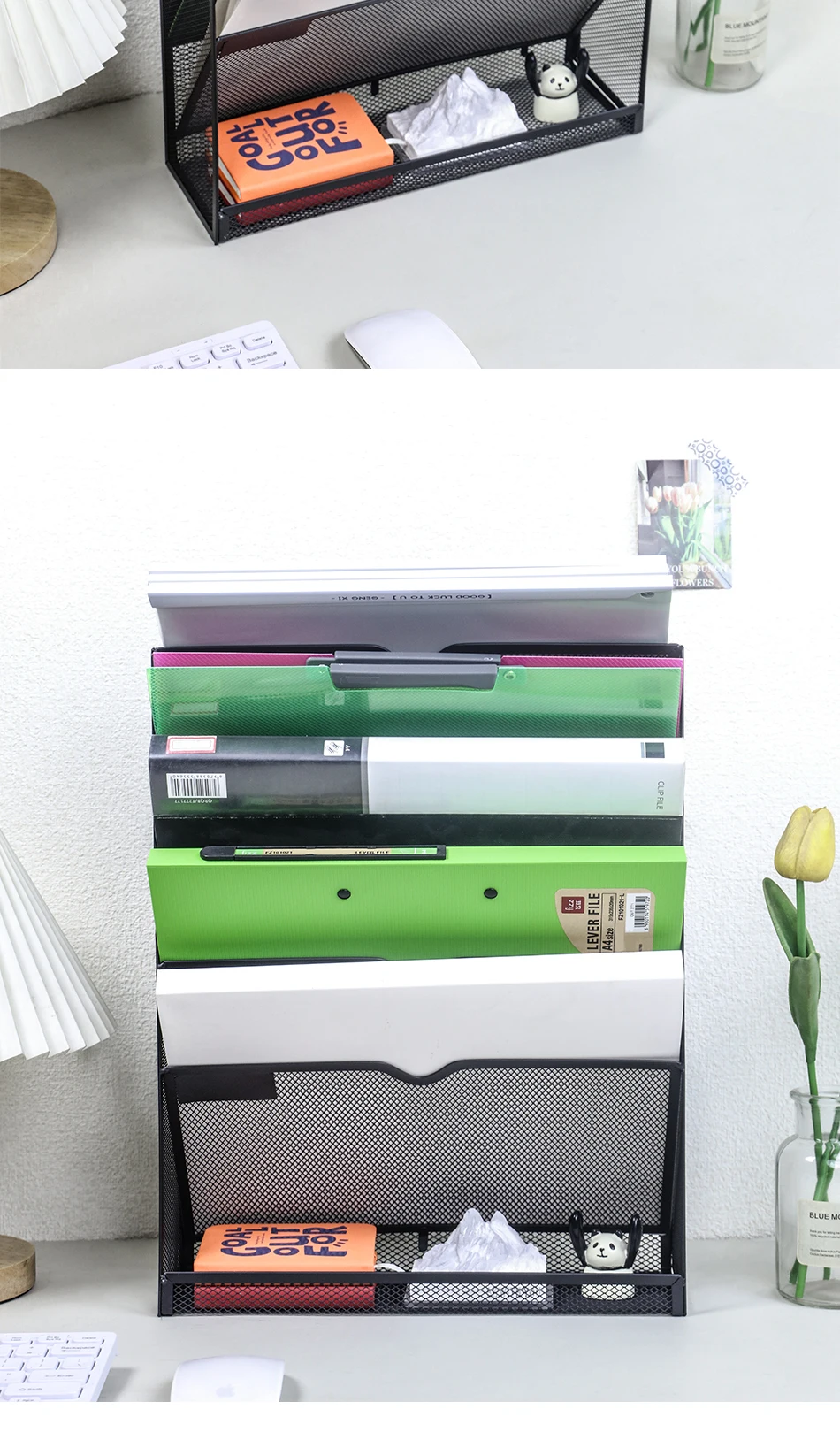 Mesh wall file storage rack 5-layer vertical mounting rack Magazine rack with bottom flat tray, side closed, black