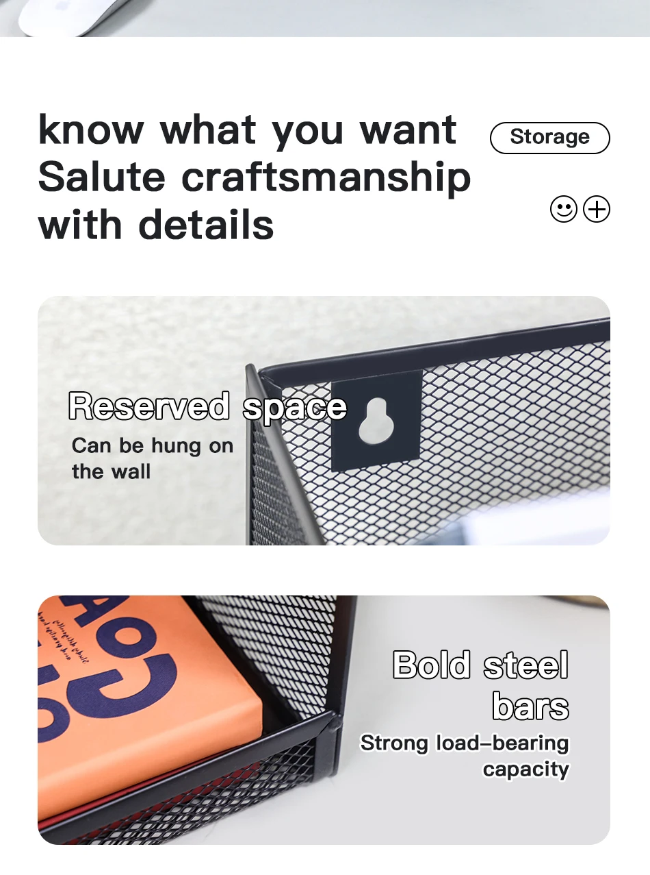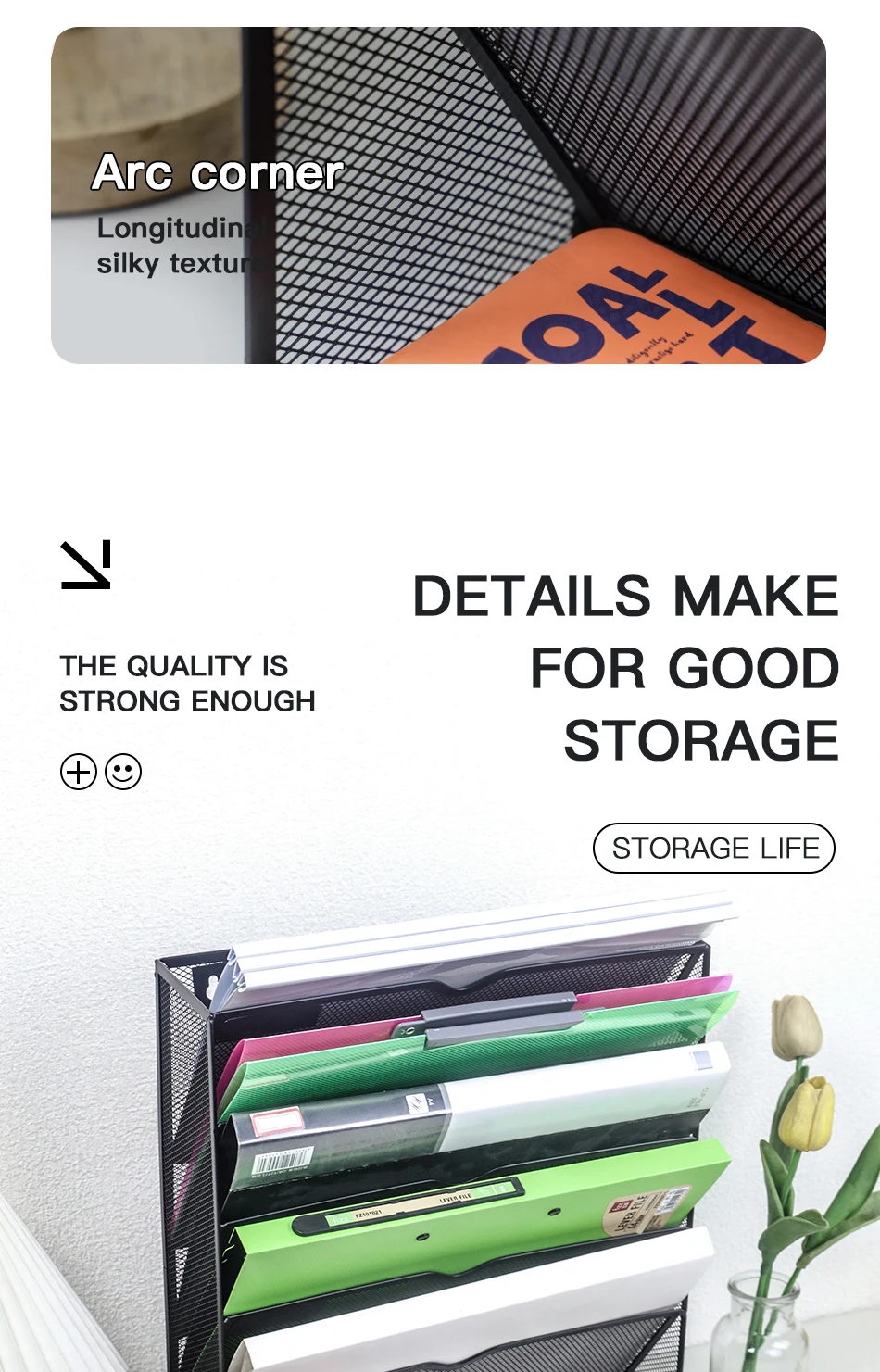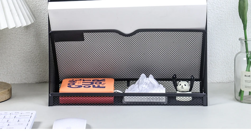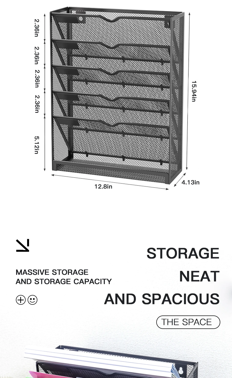 Mesh wall file storage rack 5-layer vertical mounting rack Magazine rack with bottom flat tray, side closed, black