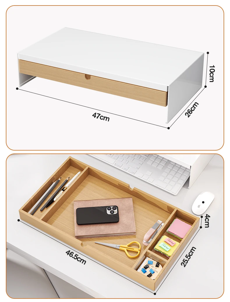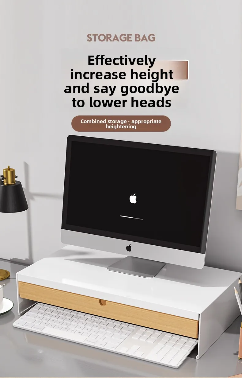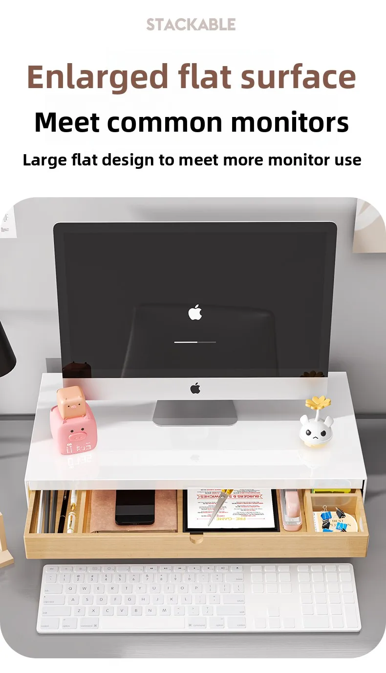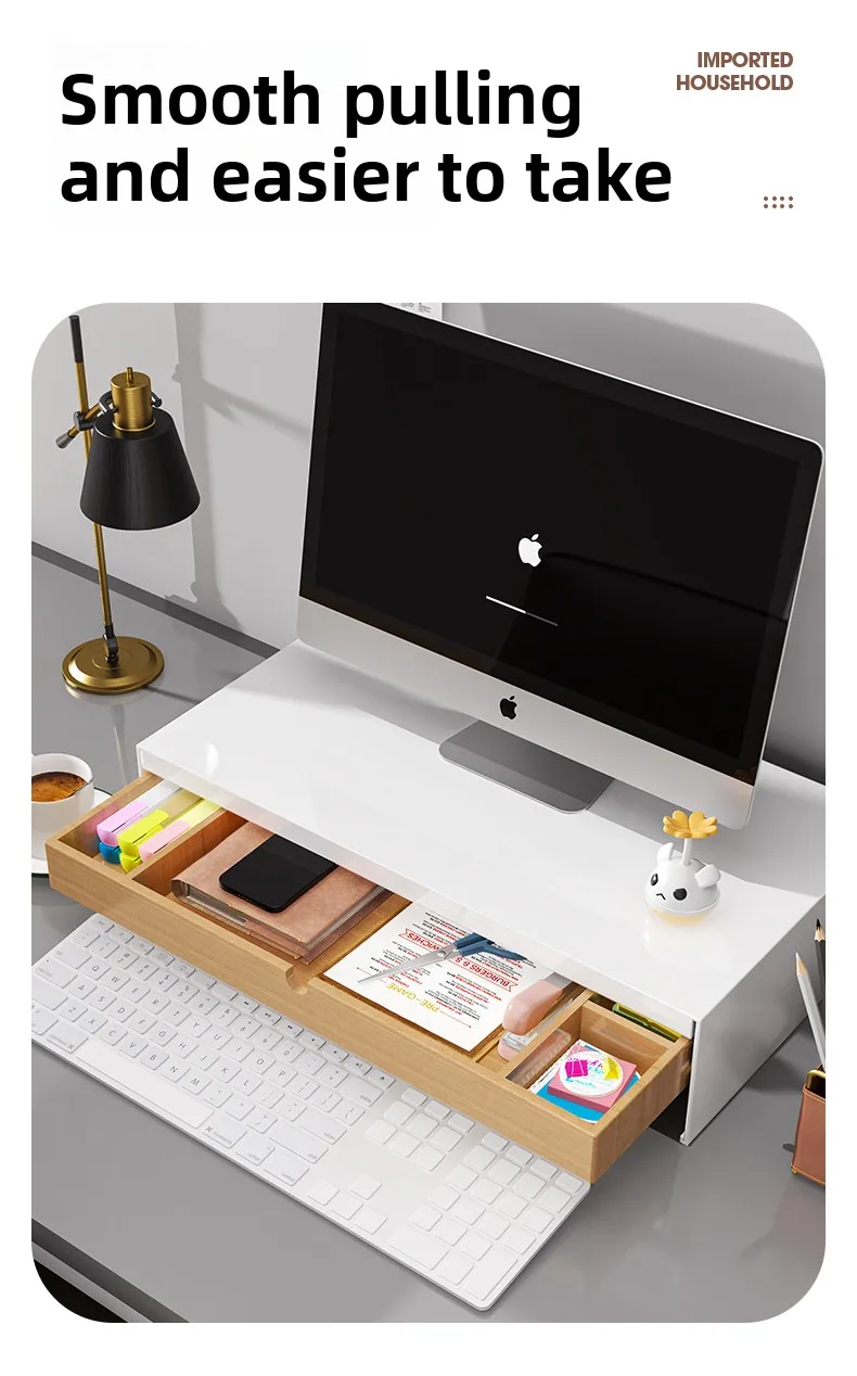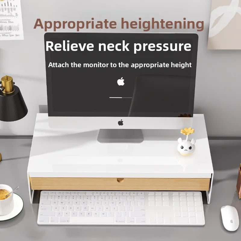 Monitor Stand Riser with Bamboo Drawer, Ergonomic Desk Organizer with Storage and Cable Management, White Monitor Stand Riser