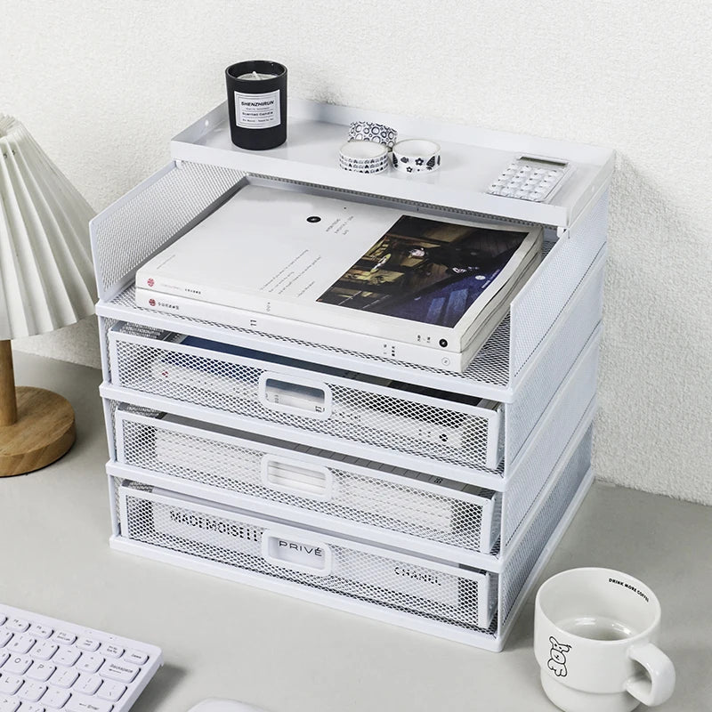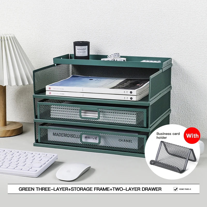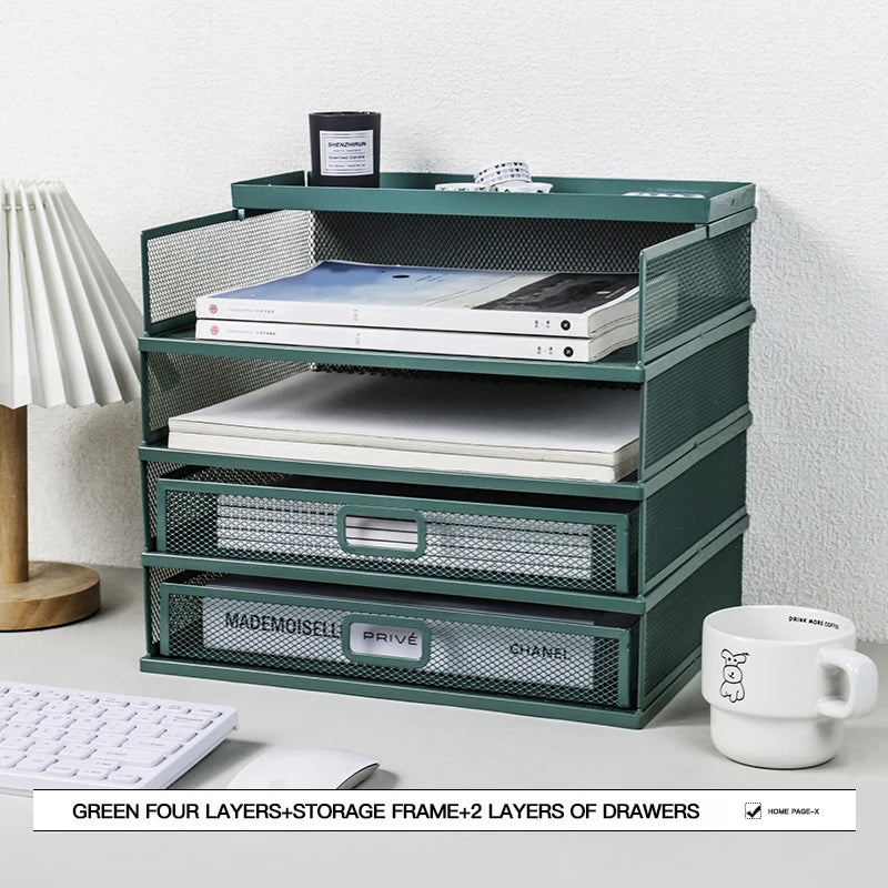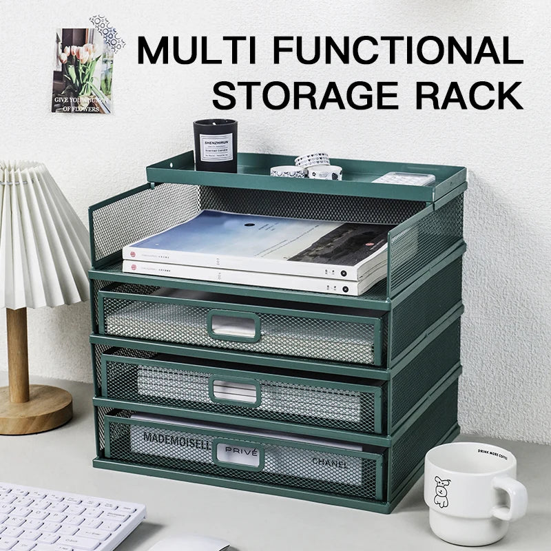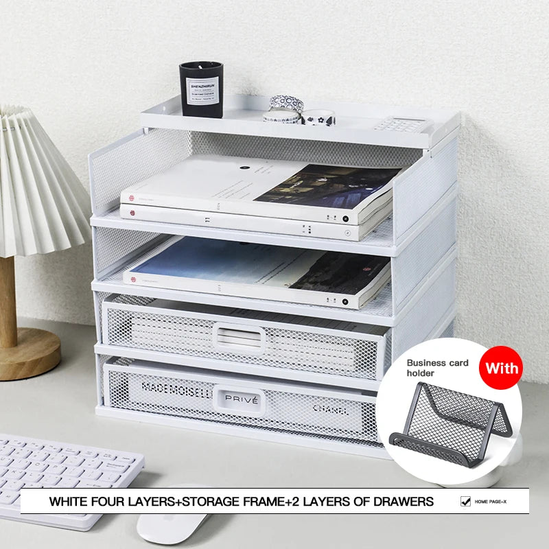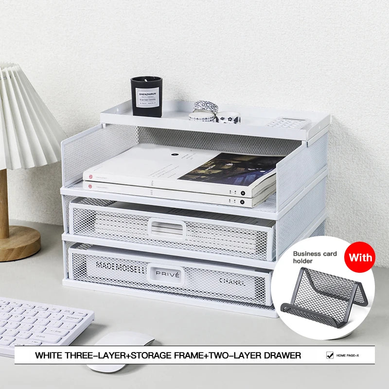 Desk storage rack with drawer, screen storage tray, multi-function classifier file rack, home office supplies storage