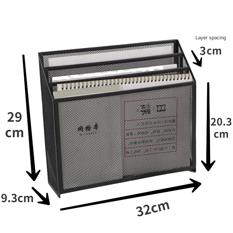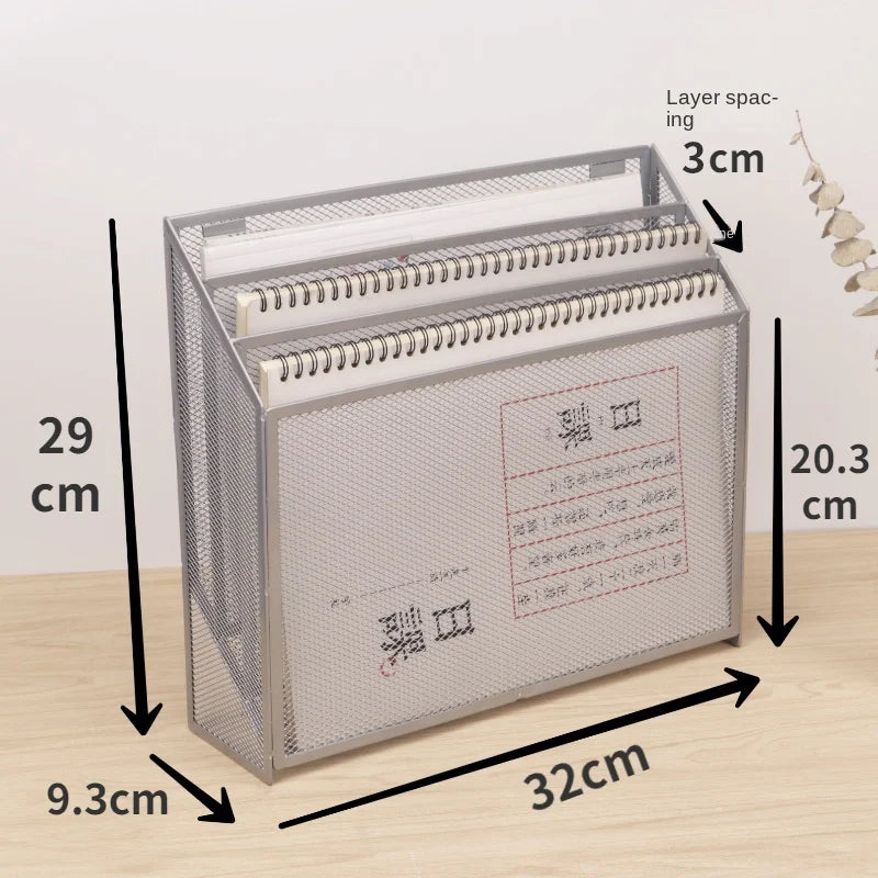 Vertical file features: The wire mesh vertical file storage basket has three tiers for clear visibility and can sit on a desk or countertop